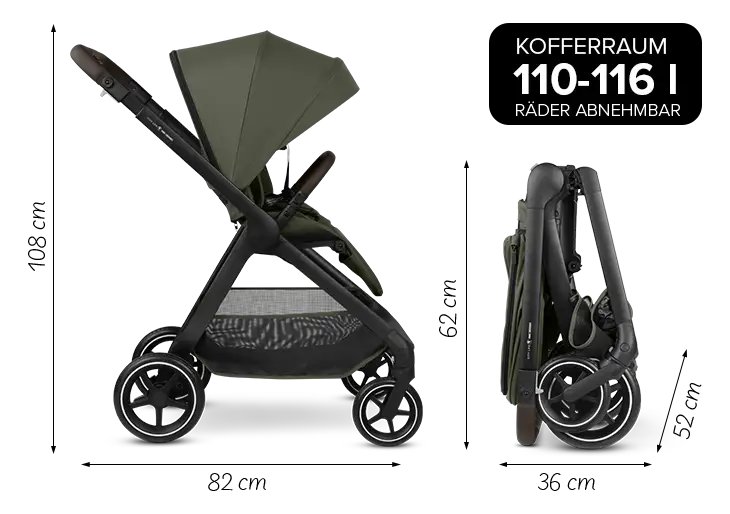Dank seines kompakten Faltmaßes passt er fast überall hinein – und kommt genauso schnell wieder heraus. Einfach zusammenklappen, einsteigen, los! Mit seinen Abmessungen punktet er nicht nur beim Falten. Auch unterwegs in der Stadt, ist sein kompaktes Design in Verbindung mit seiner leichten Manövrierbarkeit ein echter Vorteil. Mühelos lenkst Du ihn durch belebte Einkaufsstraßen oder volle Bahnsteige und findest auch in der überfüllten U-Bahn noch einen Platz. Der leichte, agile Kinderwagen ist damit der perfekte Begleiter für urbane Familien, die Wert auf Mobilität, einfaches Handling, Komfort und Style legen.