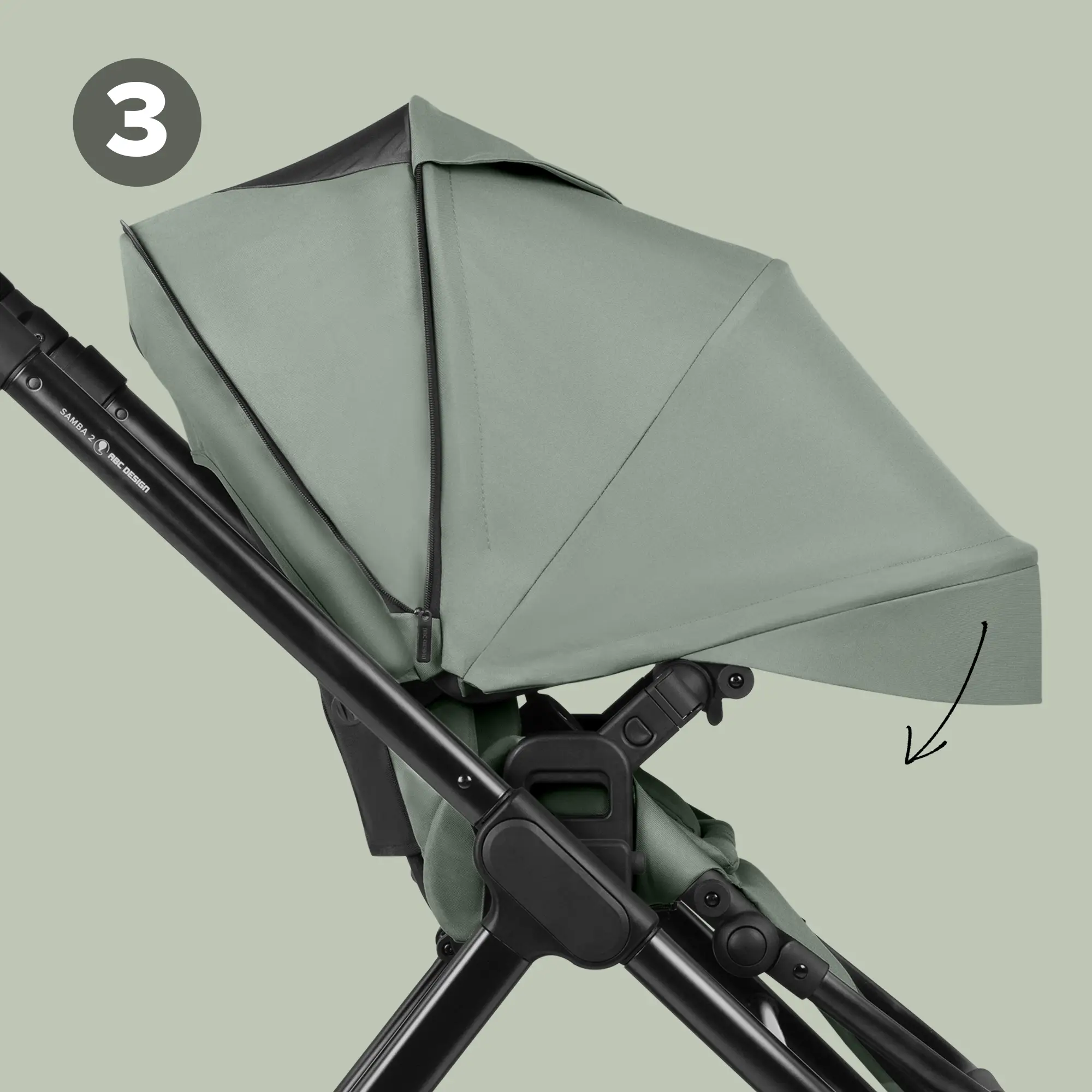 Beim Samba 2 profitierst Du von einem verlängerten Sonnenverdeck des Sportsitzes. Du kannst das Verdeck nicht nur ausklappen, sondern hast ganz vorne eine zusätzliche Sonnenblende. Diese kannst Du bei Bedarf ein- oder ausklappen. Gerade bei extremen Lichtsituationen, wie z.B. tiefstehende Abendsonne, bietet dies einen erheblichen Mehrwert für Dich und Dein Kind.