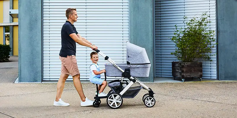 Du kannst das Board einfach an fast jedem Kinderwagen oder Buggy befestigen. Für längere Strecken gibt es auch einen zusätzlichen Sitz - das macht die Fahrt noch bequemer.